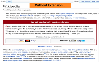 Defund Wikipedia är en praktisk webbläsartillägg för Firefox som syftar till att ta bort donation banners från Wikipedia. Denna tillägg är utformad för användare som vill ha en renare läsupplevelse utan att bli avbrutna av påminnelser om donationer. Med ett enkelt klick kan användare dölja dessa banners, vilket ger en mer fokuserad och obehindrad interaktion med innehållet på Wikipedia. Det är viktigt att notera att även om användare kan stänga banners, kommer detta endast att vara effektivt i en vecka på grund av Wikimedias cookie-policy.